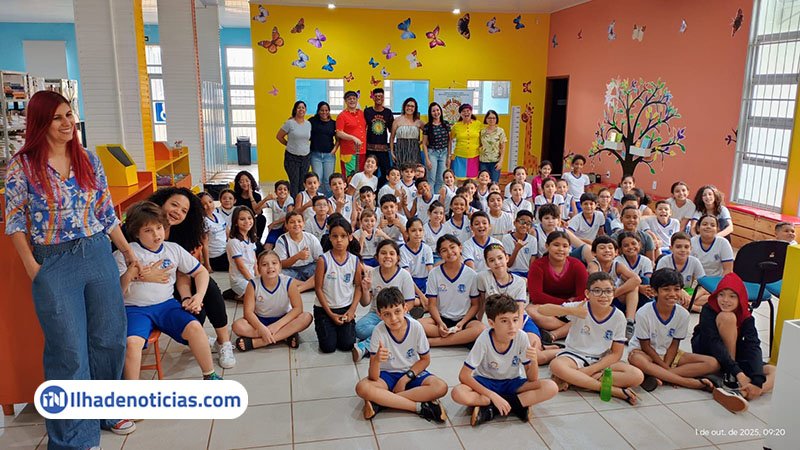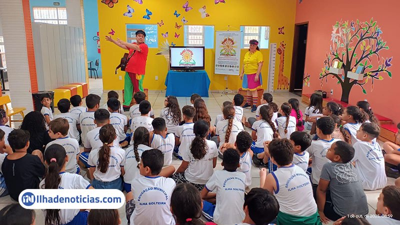 Os estudantes acompanharam a contação da história “Flicts”, obra clássica de Ziraldo, apresentada pela Cia Melissa & Paulo Teatro. A narrativa, interpretada pelos atores Melissa Nascimento e Paulo Jordão, conta a trajetória de uma cor rara, frágil e solitária em busca de pertencimento e aceitação em meio às demais cores do mundo, promovendo reflexões sobre diversidade, inclusão e empatia.