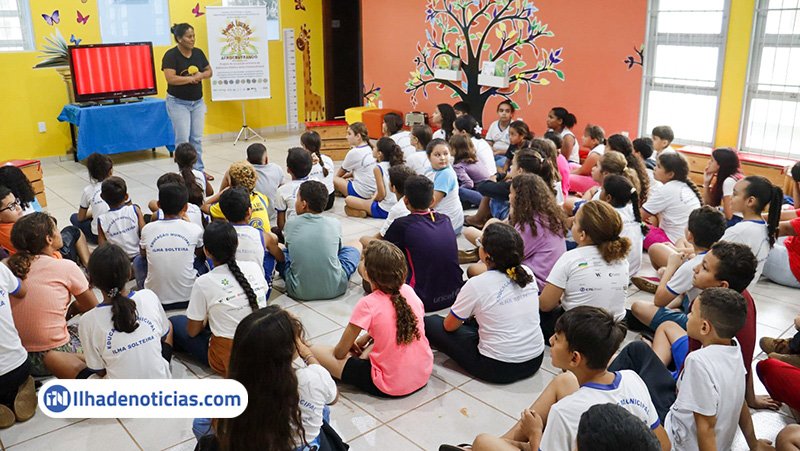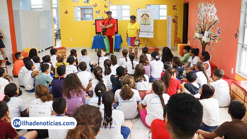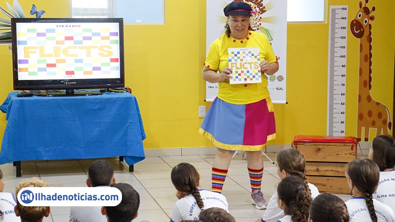 Os estudantes acompanharam a contação da história “Flicts”, obra clássica de Ziraldo, apresentada pela Cia Melissa & Paulo Teatro. A narrativa, interpretada pelos atores Melissa Nascimento e Paulo Jordão, conta a trajetória de uma cor rara, frágil e solitária em busca de pertencimento e aceitação em meio às demais cores do mundo, promovendo reflexões sobre diversidade, inclusão e empatia.