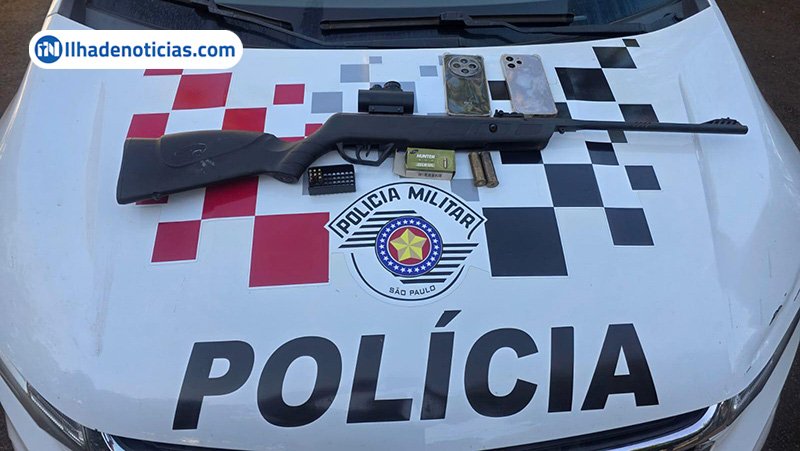 Segundo a Polícia Militar, a arma, uma espingarda adaptada para calibre .22, foi encontrada no interior de um veículo, junto com uma mira Red Dot, munições e cartuchos.