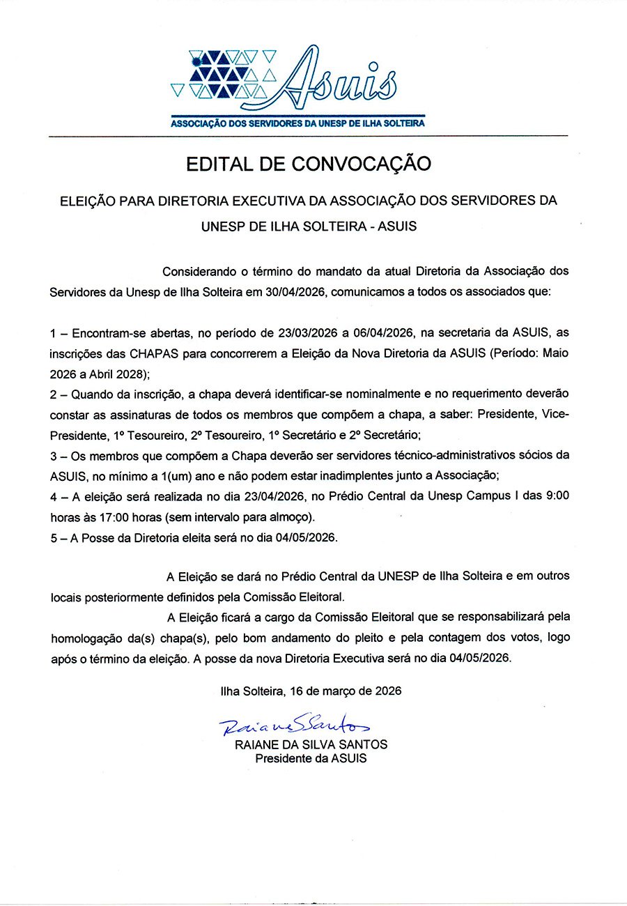 A presidente da Associação dos Servidores da UNESP de Ilha Solteira, Sra. Raiane da Silva Santos, usando suas atribuições legais, considerando o término do mandato da atual diretoria, em 30/04/2026, comunica a todos a abertura para a inscrição de chapas para a eleição, entre 23 de março e 6 de abril.