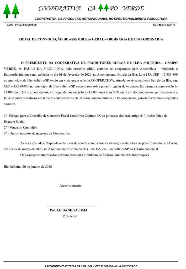 O presidente da Cooperativa de Produtores Rurais de Ilha Solteira – Campo Verde, Sr. Paulo da Silva Lima, convoca os cooperados para Assembleia – Ordinária e Extraordinária -, que será realizada no dia 1º de fevereiro de 2026, no Assentamento Estrela da Ilha.