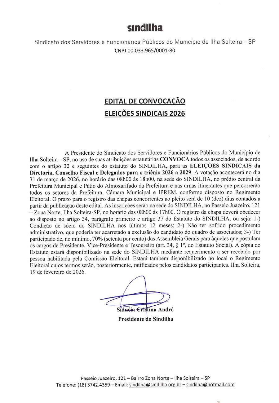 A presidente do Sindicato dos Servidores e Funcionários Públicos do Município de Ilha Solteira, Sra. Sidneia Cristina André, usando suas atribuições legais, convoca os associados para as Eleições Sindicais da Diretoria, Conselho Fiscal e Delegados para o Triênio 2026 a 2029, que será realizada no dia 31 de março de 2026, das 8h às 18h, na sede do SindIlha.