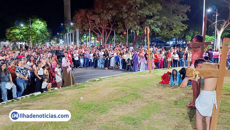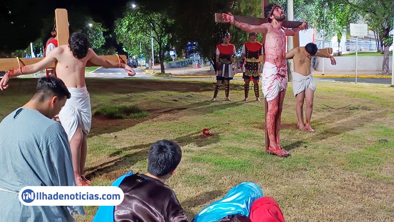 A apresentação foi conduzida por integrantes do grupo de jovens Emmanuel, da Igreja Católica, que deram vida às estações da Via-Sacra — uma prática religiosa que relembra o caminho percorrido por Jesus Cristo desde sua condenação até a crucificação e sepultamento.