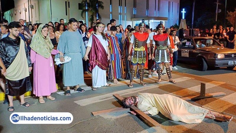 A comunidade católica viveu momentos de fé e emoção na noite desta sexta-feira (3), coma encenação da Via-sacra, durante a tradicional Procissão do Senhor Morto. A celebração reuniu fiéis que acompanharam, com atenção e devoção, ao longo do percurso pelo centro da Avenida Brasil.