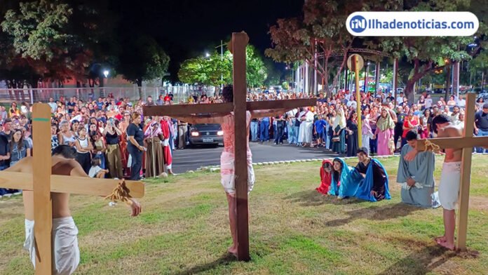 A apresentação foi conduzida por integrantes do grupo de jovens Emmanuel, da Igreja Católica, que deram vida às estações da Via-Sacra — uma prática religiosa que relembra o caminho percorrido por Jesus Cristo desde sua condenação até a crucificação e sepultamento.