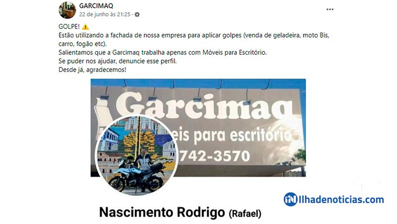 “Estão utilizando a fachada de nossa empresa para aplicar golpes (venda de geladeira, moto Biz, carro, fogão etc). Salientamos que a Garcimaq trabalha apenas com móveis para escritório. Se puder nos ajudar, denuncie esse perfil”.